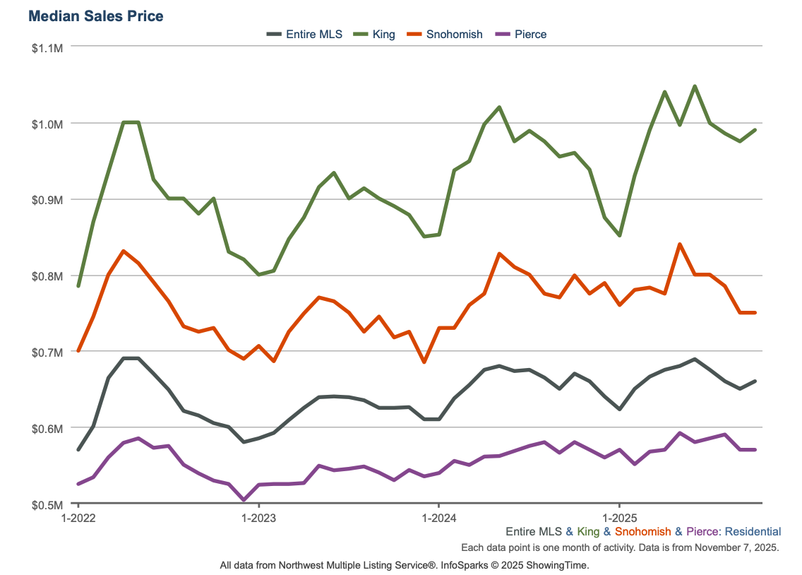 With the data from October 2025 in, here’s an overview of the key aspects of the local real estate market. The real estate data below is collected from Northwest Multiple Listing Service (NWMLS).