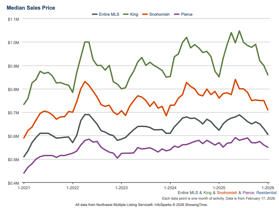 With the data from January 2026 in, here’s an overview of the key aspects of the local real estate market. The real estate data below is collected from Northwest Multiple Listing Service (NWMLS).